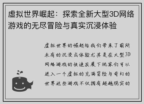 虚拟世界崛起:探索全新大型3D网络游戏的无尽冒险与真实沉浸体验