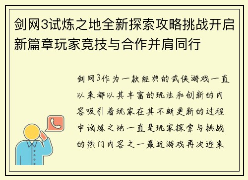 剑网3试炼之地全新探索攻略挑战开启新篇章玩家竞技与合作并肩同行